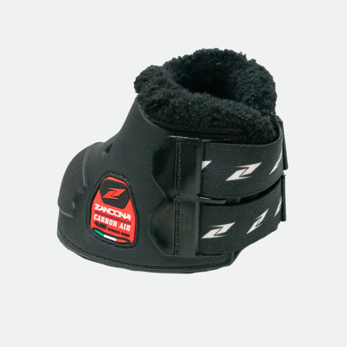 Les cloches protège-glomes CARBON AIR HEEL signées Zandona ont été développées pour protéger le cheval dans toutes les disciplines, elles sont réalisées à 100 % en Italie et conçues pour protéger la zone carotide du cheval de l'éventualité de tout choc ou frottement. Les Carbon Air Heel ont un haut pouvoir de protection et tiennent bien en place sur le paturon sans nuire à la flexibilité de l'articulation et conviennent à la plupart des formes de talons. Une doublure en fourrure artificielle figure sur la partie supérieur pour optimiser le confort. La technologie Gel-Tech est reconnue pour ses capacités d'absorption des chocs et offre un confortable matelassage. Ces cloches de protection sont respirantes grâce aux 6 évents d'aération répartis sur le néoprène perforé. Les éléments en fibre de carbone sont placés sous la coque extérieure, ils isolent thermiquement les articulations par le biais de la chaleur générée par la friction et améliorent la résistance mécanique aux impacts. Les bandes de fermeture élastiques et leurs boutons ont été spécialement conçus pour assurer une fermeture très sûre en termes de sécurité. La taille tout comme la forme ergonomique ont été développées en suivant parfaitement les contours du membre, assurant un parfait positionnement et évitant ainsi tout ennui.