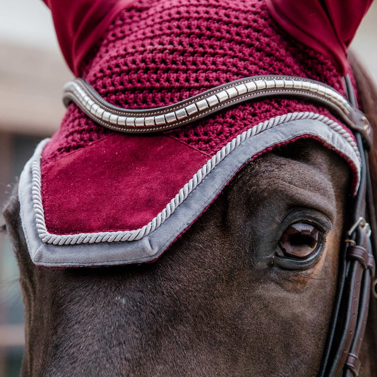 • Il possède des détails en velvet très élégants. Le tissu autour des oreilles est extensible et ajusté. Il protège les oreilles du cheval contre les mouches pendant le travail. La partie au niveau du cou est plus longue et ne peut donc pas glisser.