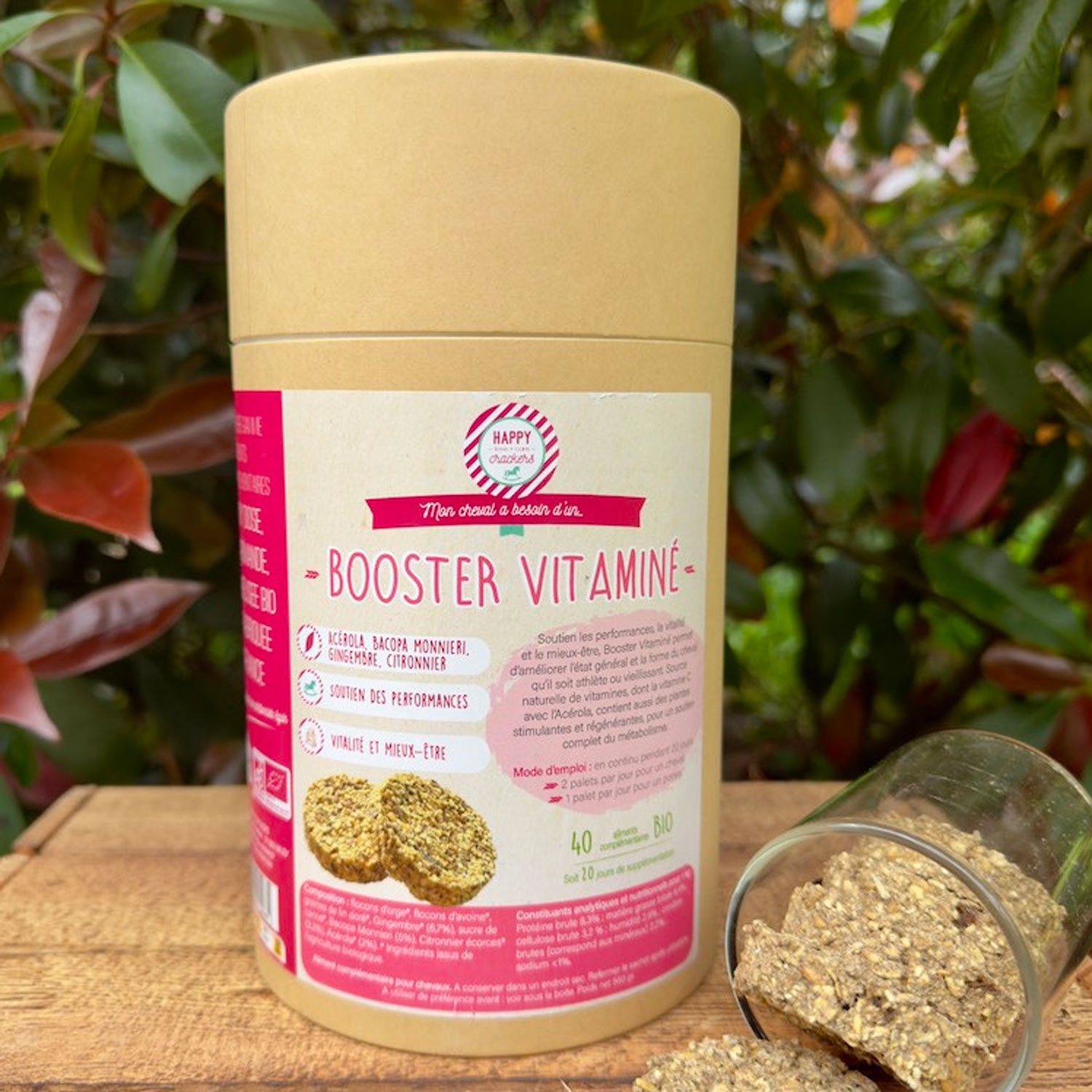 Le Complément Booster Vitaminé Bio de Happy Crackers est un aliment complémentaire formulé pour soutenir la forme générale et la vitalité du cheval, qu’il soit athlète, vieillissant ou simplement soumis à des périodes plus exigeantes. Sa recette repose sur une association de plantes reconnues pour leur action stimulante et régénérante, afin d’accompagner l’organisme de manière globale.